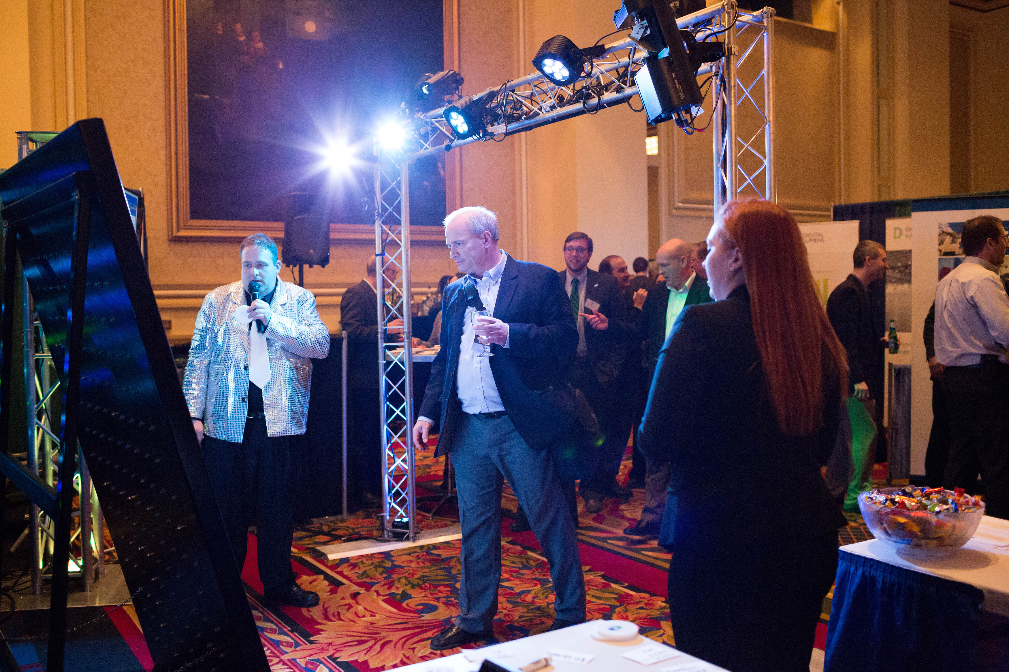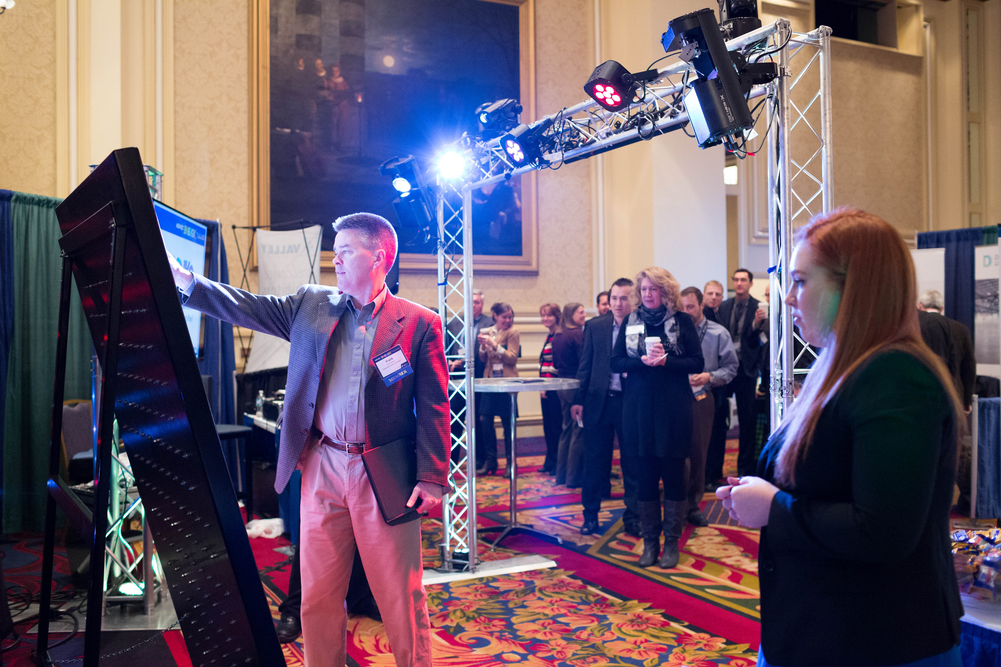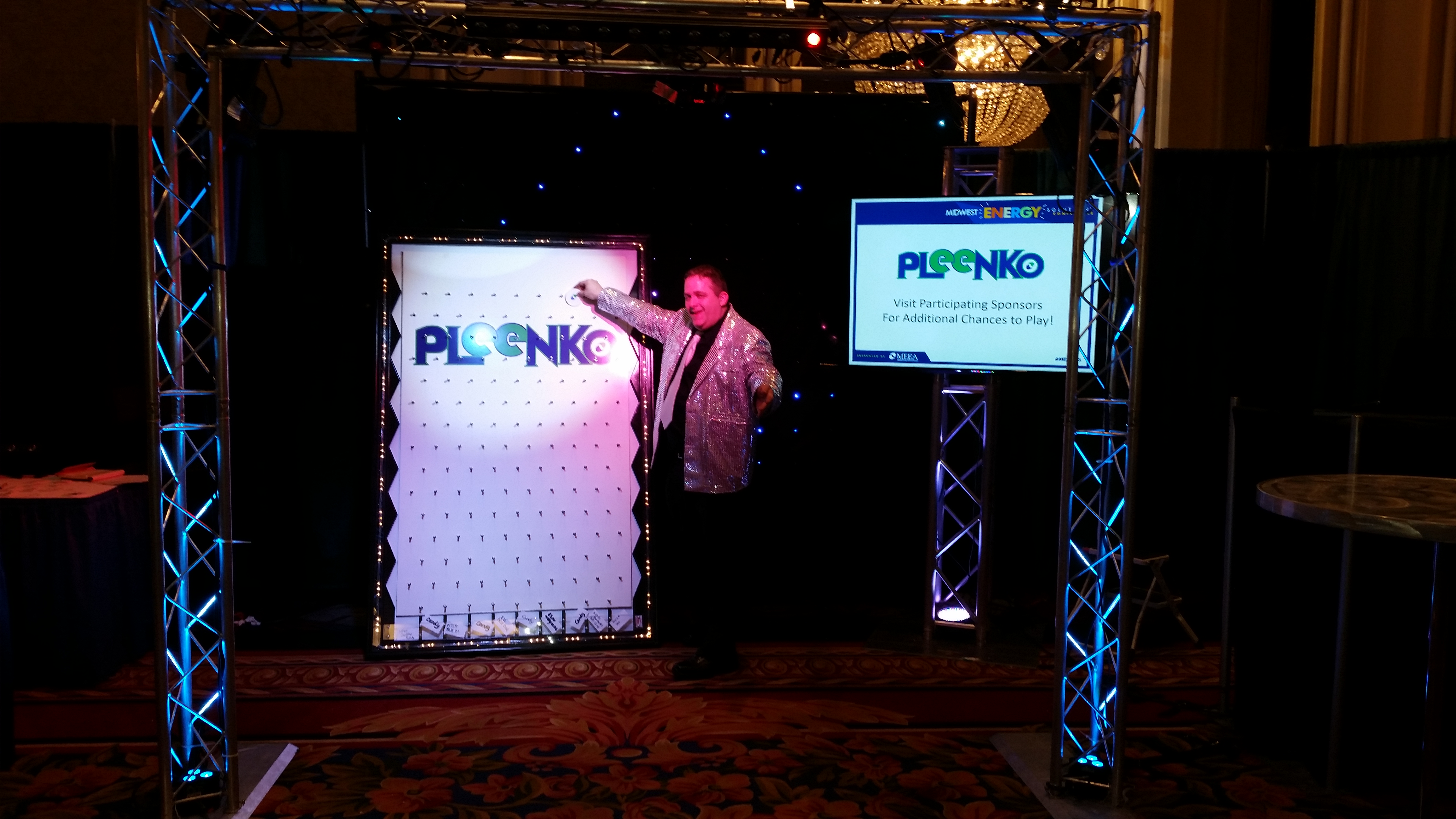 One of our clients invites trade show attendees to drop a plinko chips to win prizes donated by the trade show exhibitors. This builds traffic for the entire trade show and creates a lot of excitement. For their event, we added lights, video display, and some razzle dazzle. We can even customize the graphics — perfect for branding.